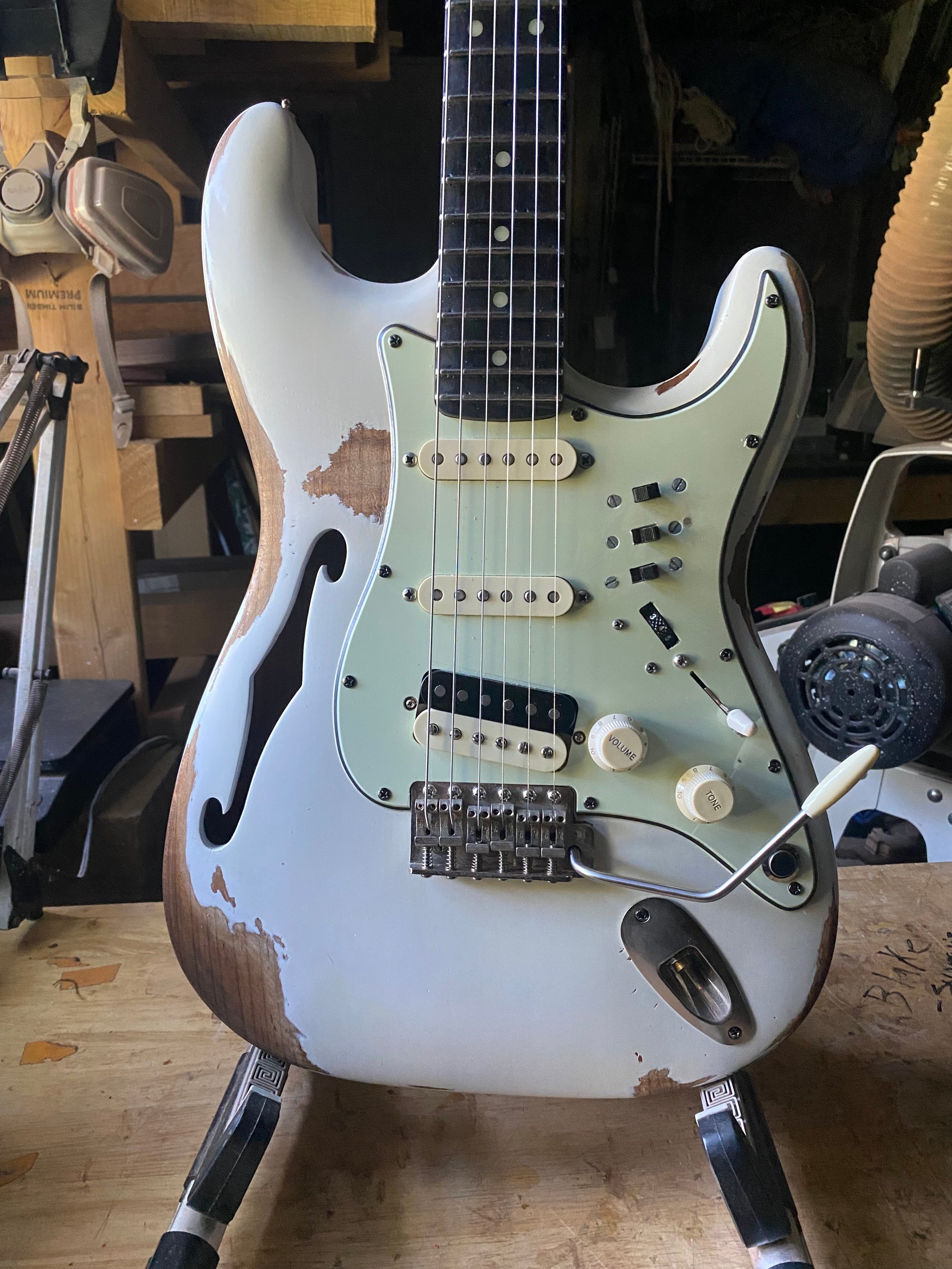 Semi-hollow Superstrat with multiple wiring options. Traditional shape but semi-hollow with carved Top and optional carved back.